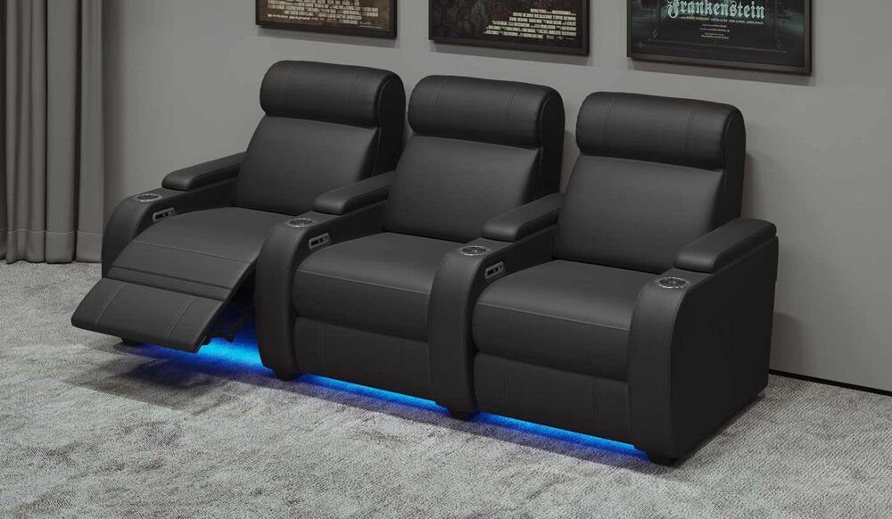 Luxury 3 seat home cinema seating with electric reclining, Italian leather upholstery, and premium features. Perfect home theatre seating UK for golf simulator rooms. USB charging, LED lighting, drink holders. 10-year guarantee.