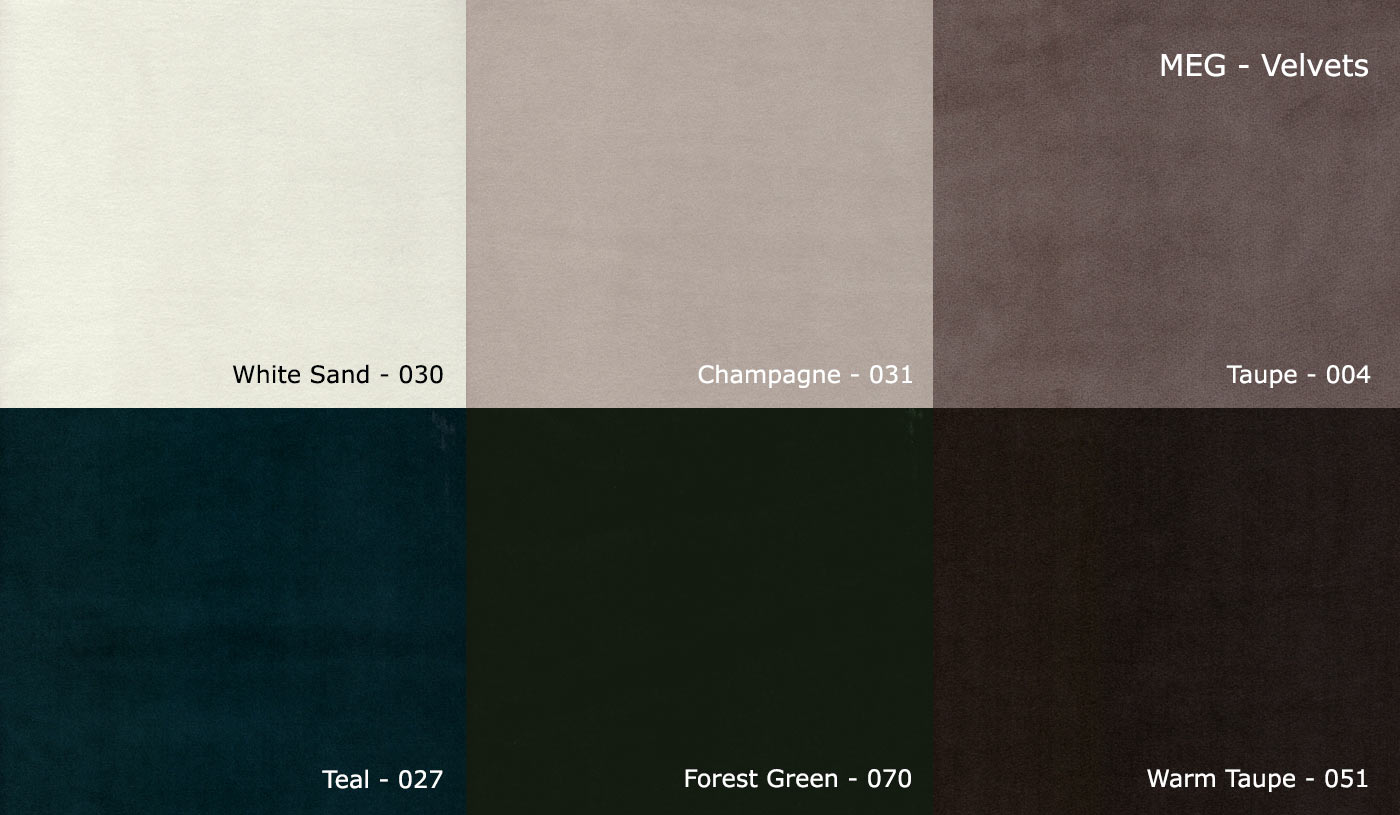 • Available in 12 water-repellent pet-friendly Zoya fabrics and 13 ultra-soft Meg velvets