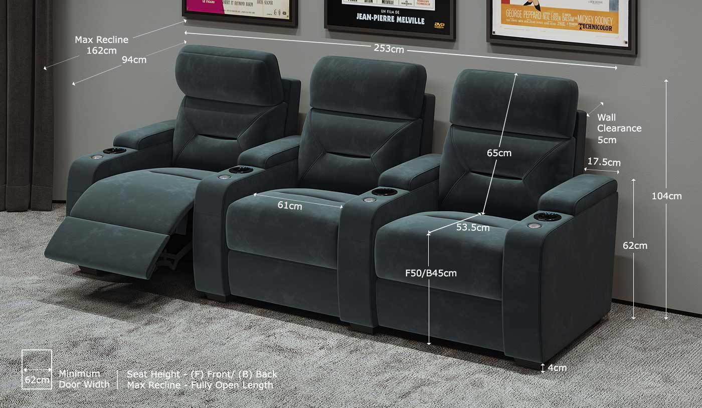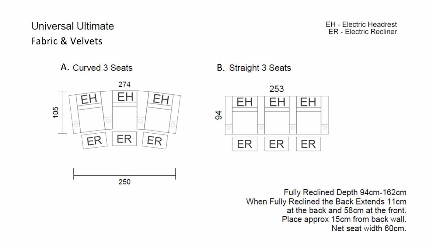 Built on a solid wood and plywood frame that is glued, screwed, and reinforced at all structural areas, these cinema chairs come with a free 10-year frame and springs guarantee. The zig-zag metal sprung base upholstery with high-quality reflex foam ensures lasting comfort. Choose between a curved configuration (W274 x D105 x H104 cm) or straight layout (W253 x D94 x H104 cm) to suit your room. Each seat weighs 55 kg and requires one power source, with a fully reclined length of 160-162 cm.