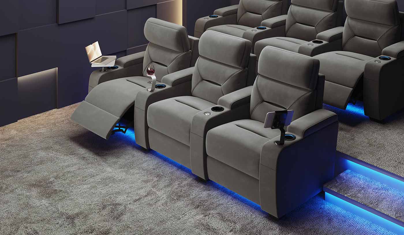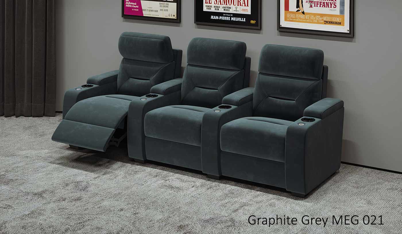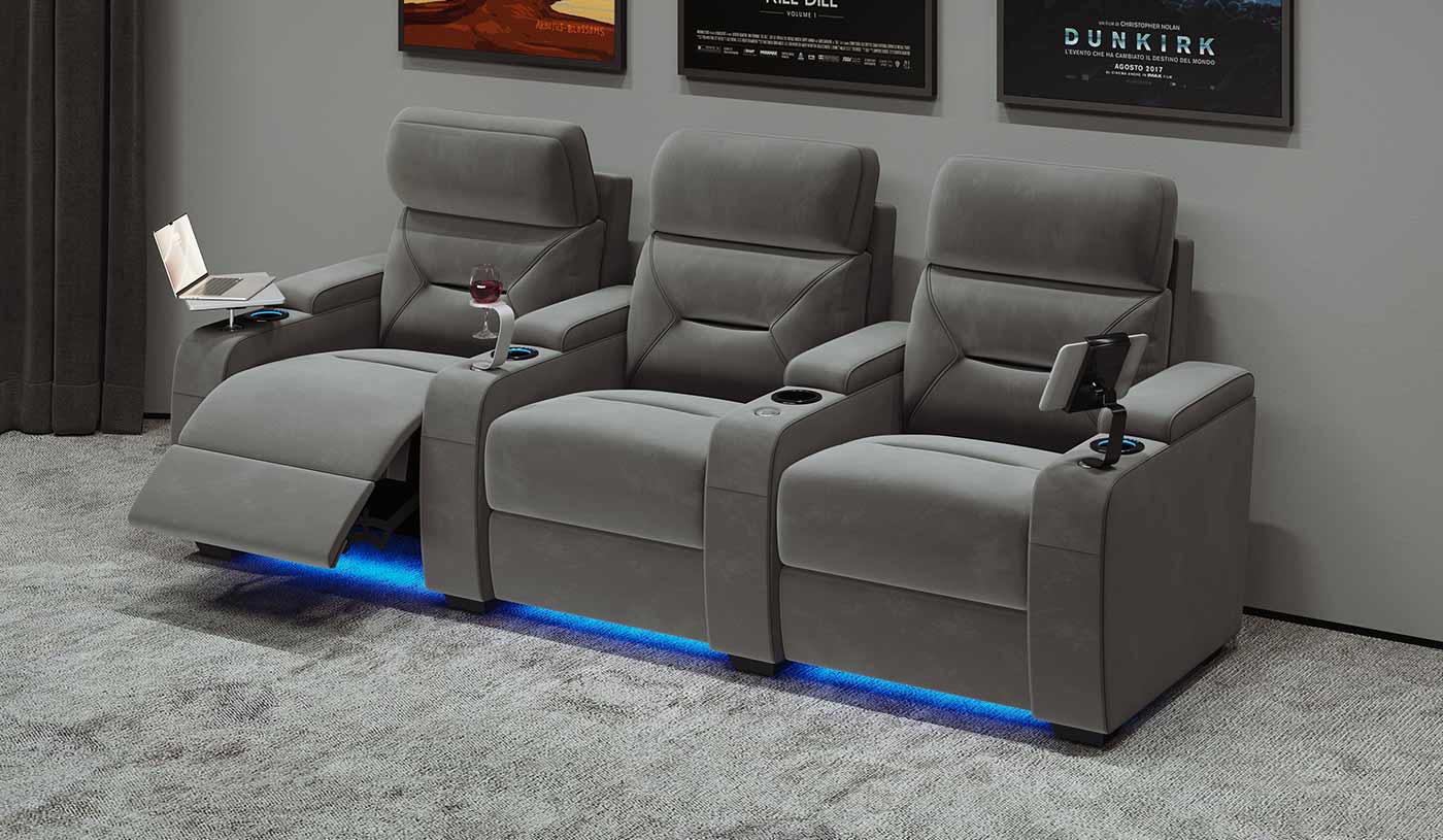 Transform your golf simulator room with the Universal Ultimate 3-seat fabric cinema chairs featuring dual motor electric recline, built-in massage, and cooling cup holders. Premium home cinema seating available in 25 luxurious fabric and velvet options.