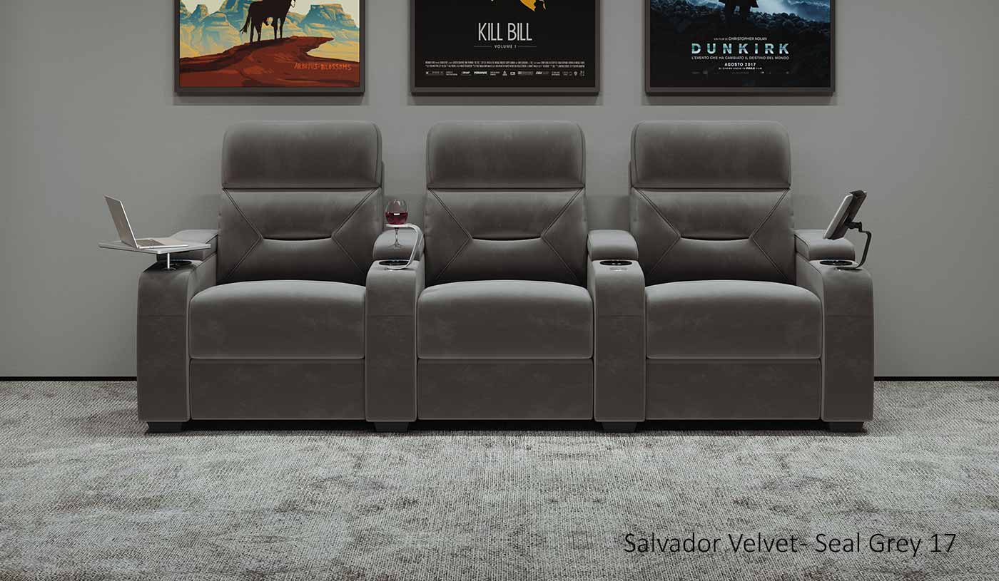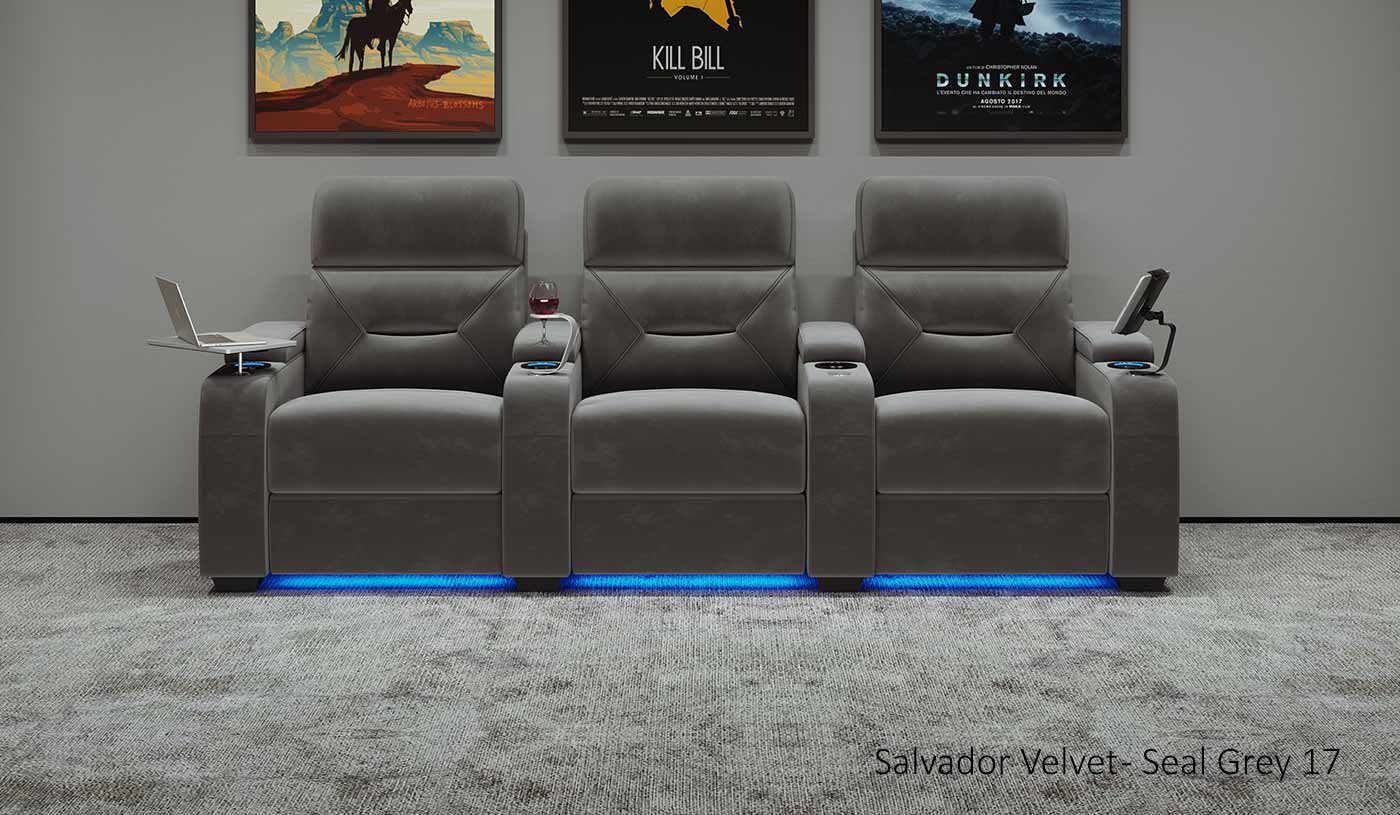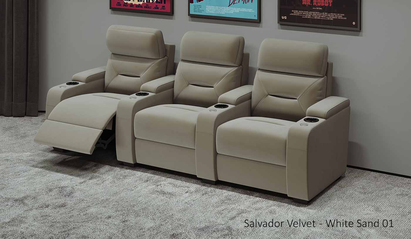 Transform your golf simulator room with the Universal Ultimate 3-seat fabric cinema chairs featuring dual motor electric recline, built-in massage, and cooling cup holders. Premium home cinema seating available in 25 luxurious fabric and velvet options.