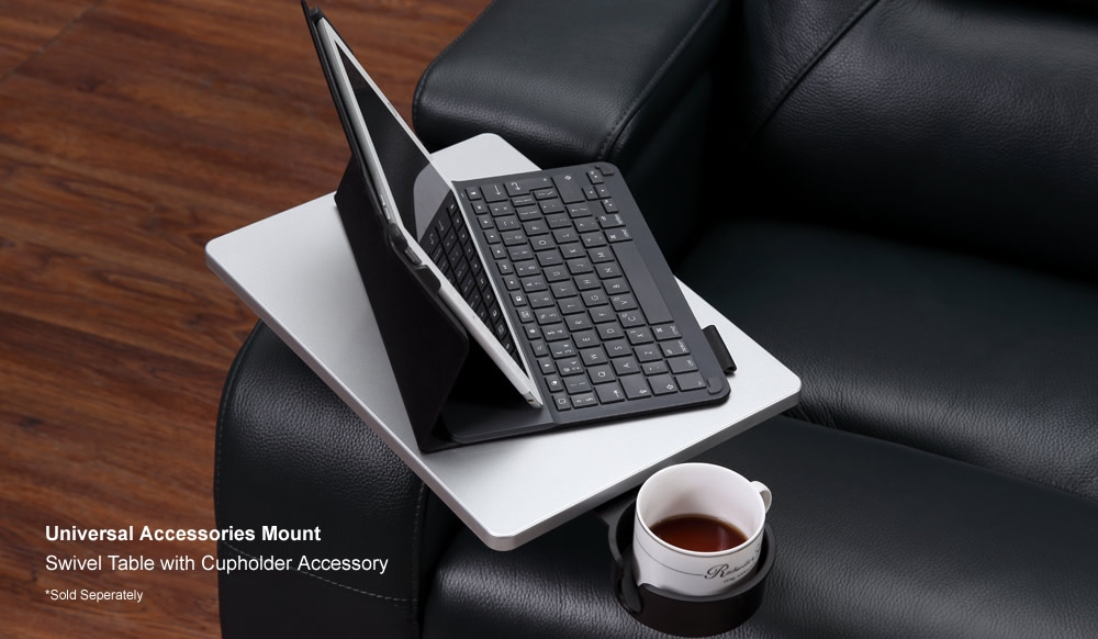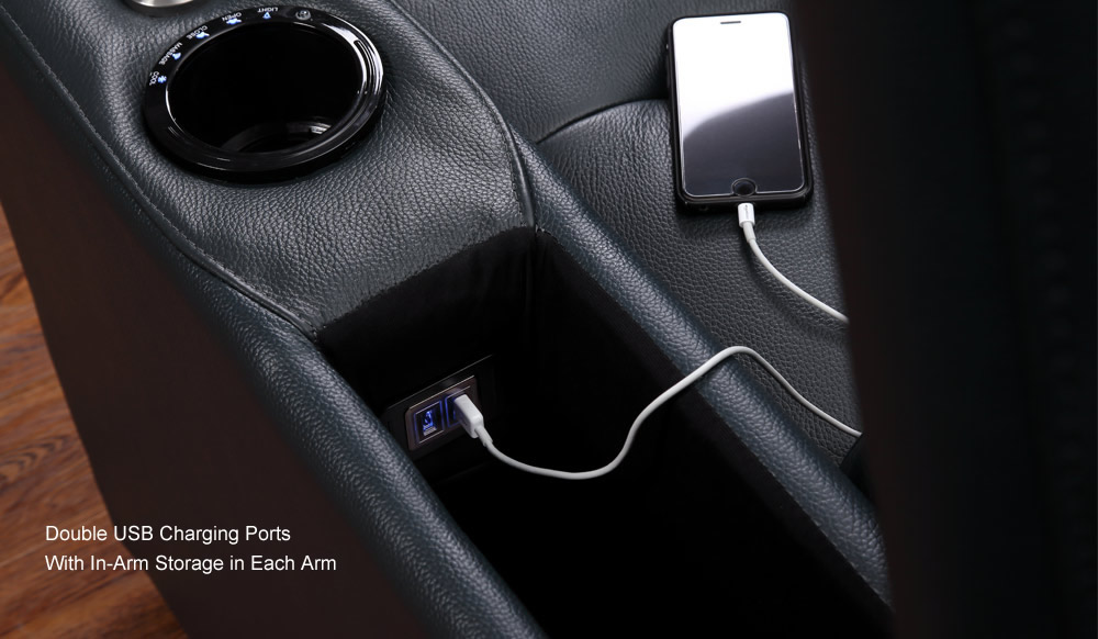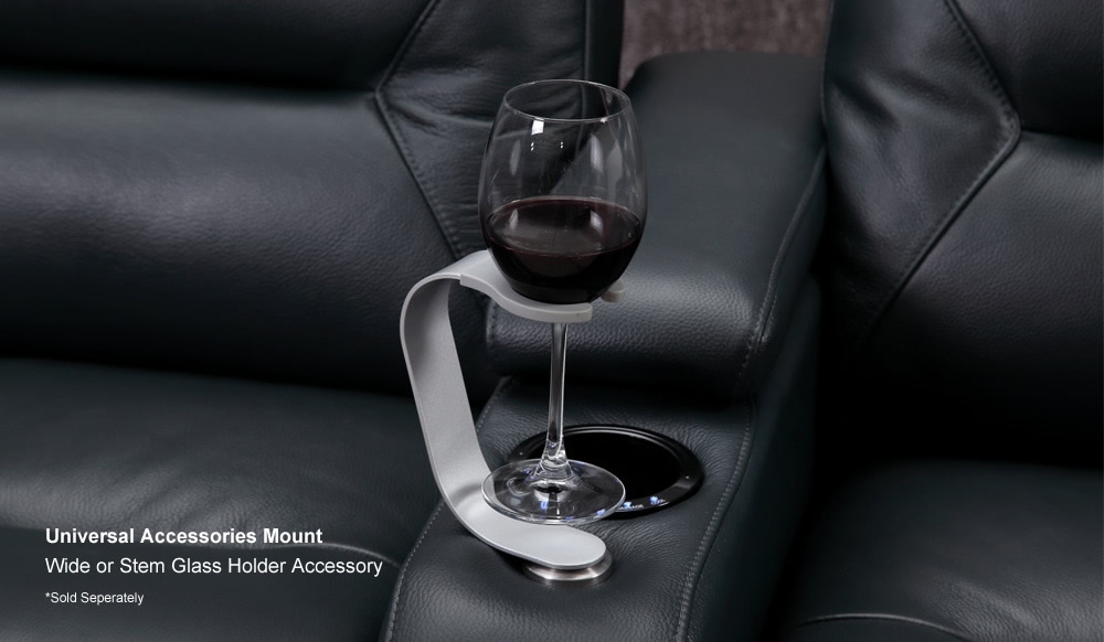 Every seat includes a built-in massage function in the seat back, a black ceramic cup holder with cooling function to keep drinks chilled, and inductive touch-sensitive controls discreetly integrated into the cupholder. Blue LED cupholder lights and a row of base lights under the seats create atmospheric ambient lighting. In-arm storage compartments and dual USB chargers in all powered arms keep devices charged and essentials close to hand. Optional swivel table, wine glass holder, and tablet holder accessories are also available.