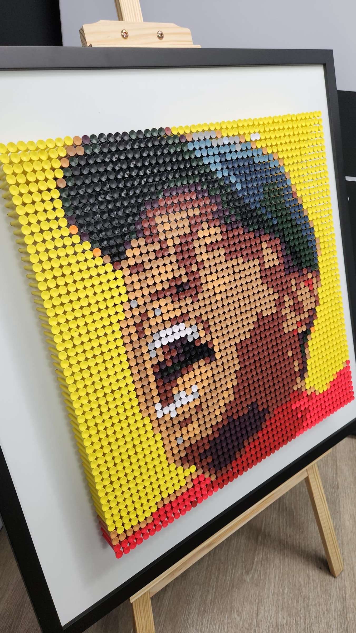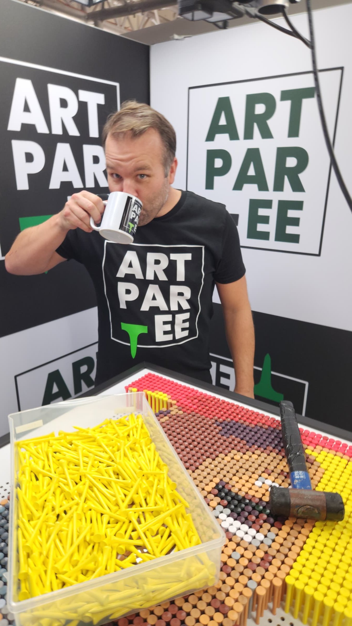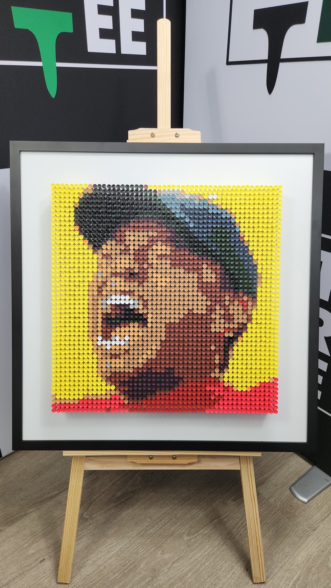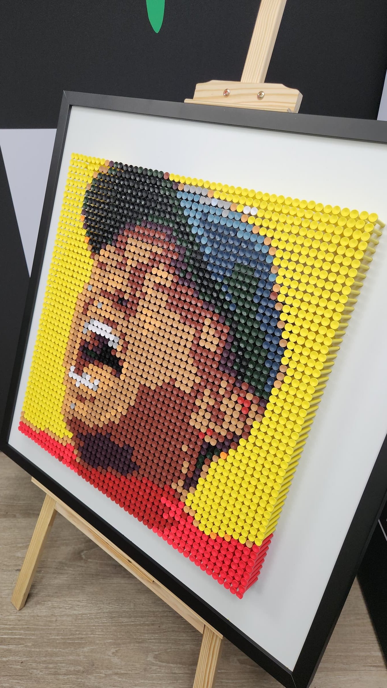 Each piece is a stunning example of bamboo golf tee artistry. Created using thousands of individually placed colored bamboo tees, these artworks capture iconic moments in sporting history through the timeless technique of pointillism.