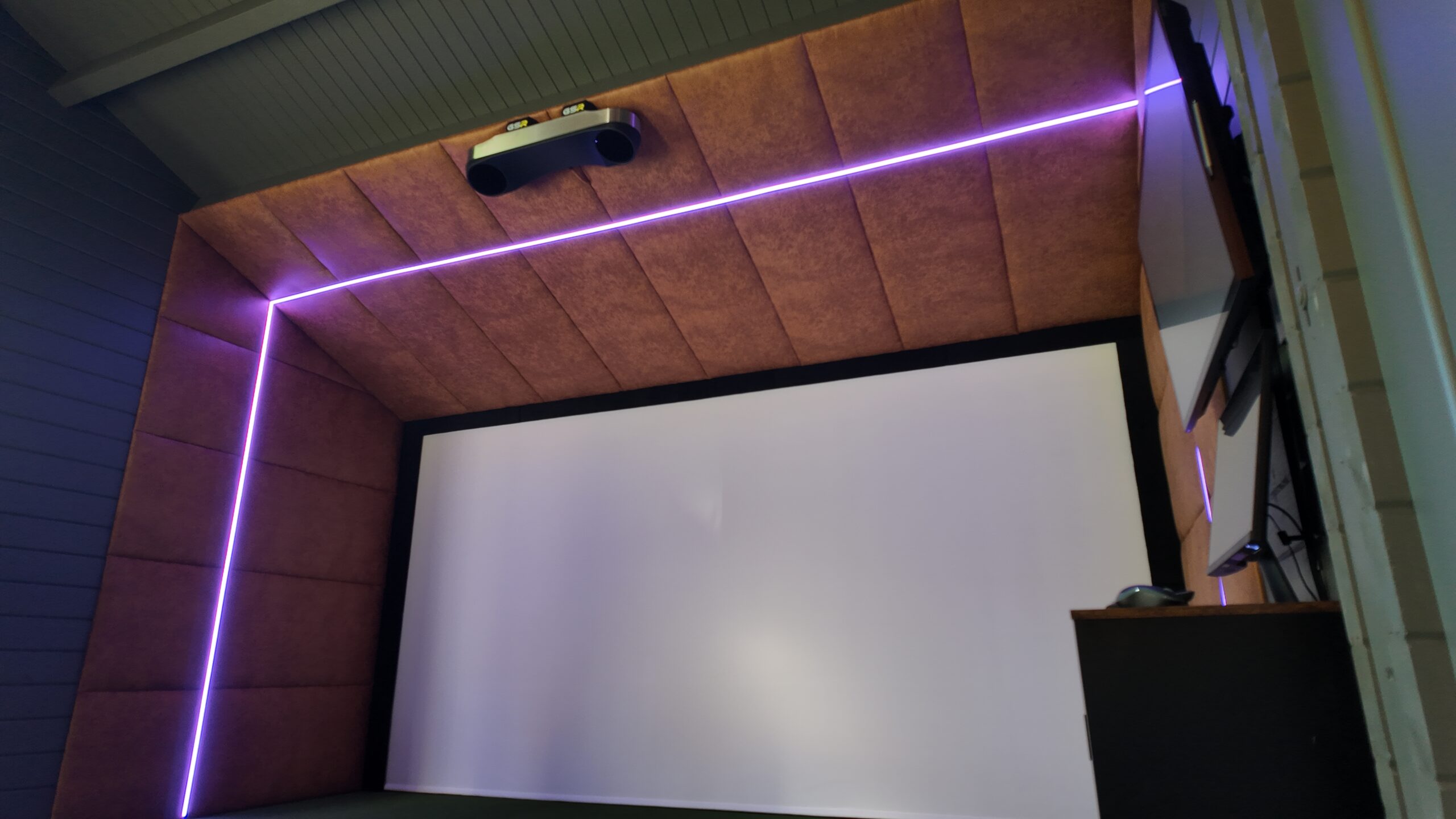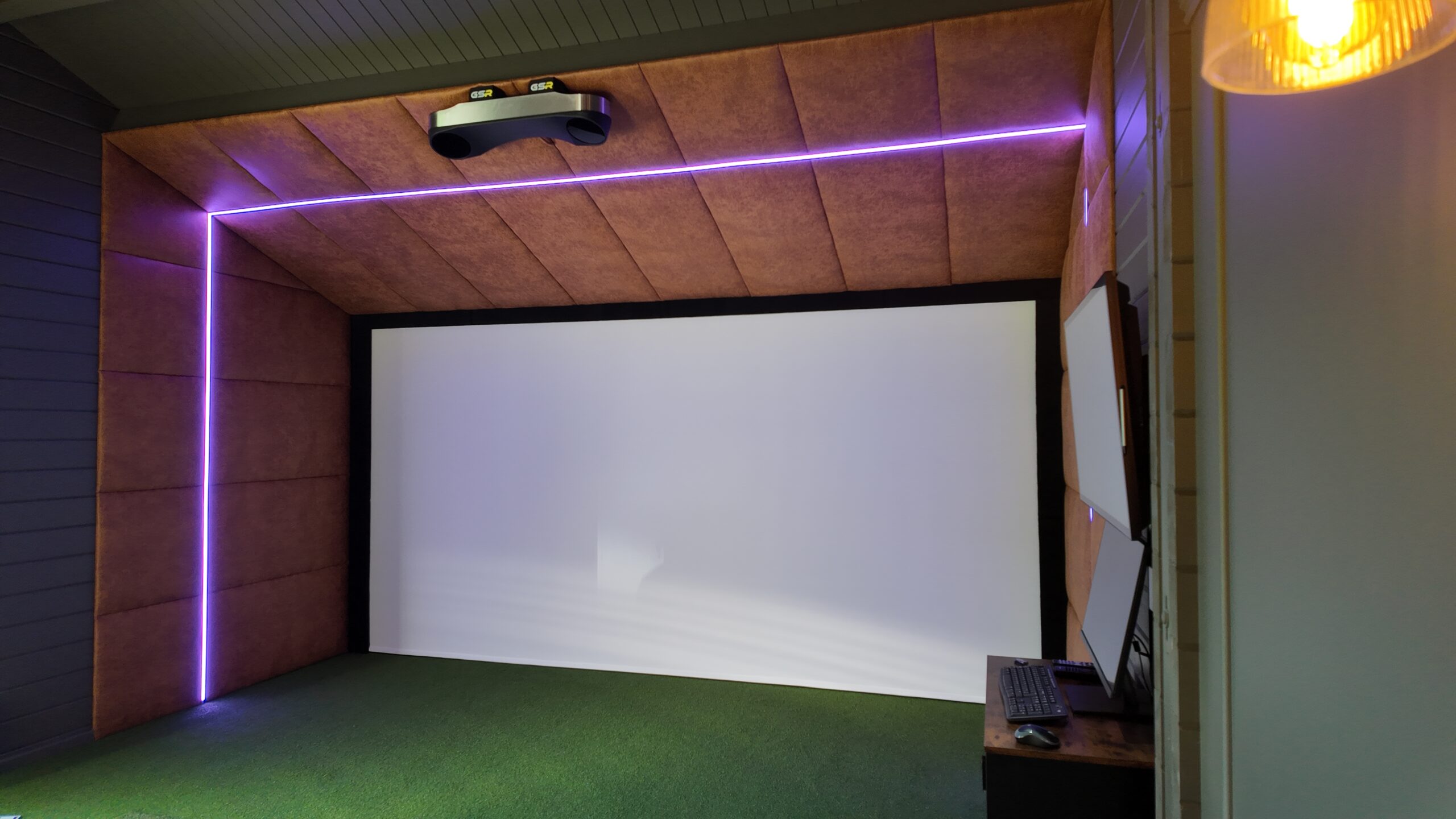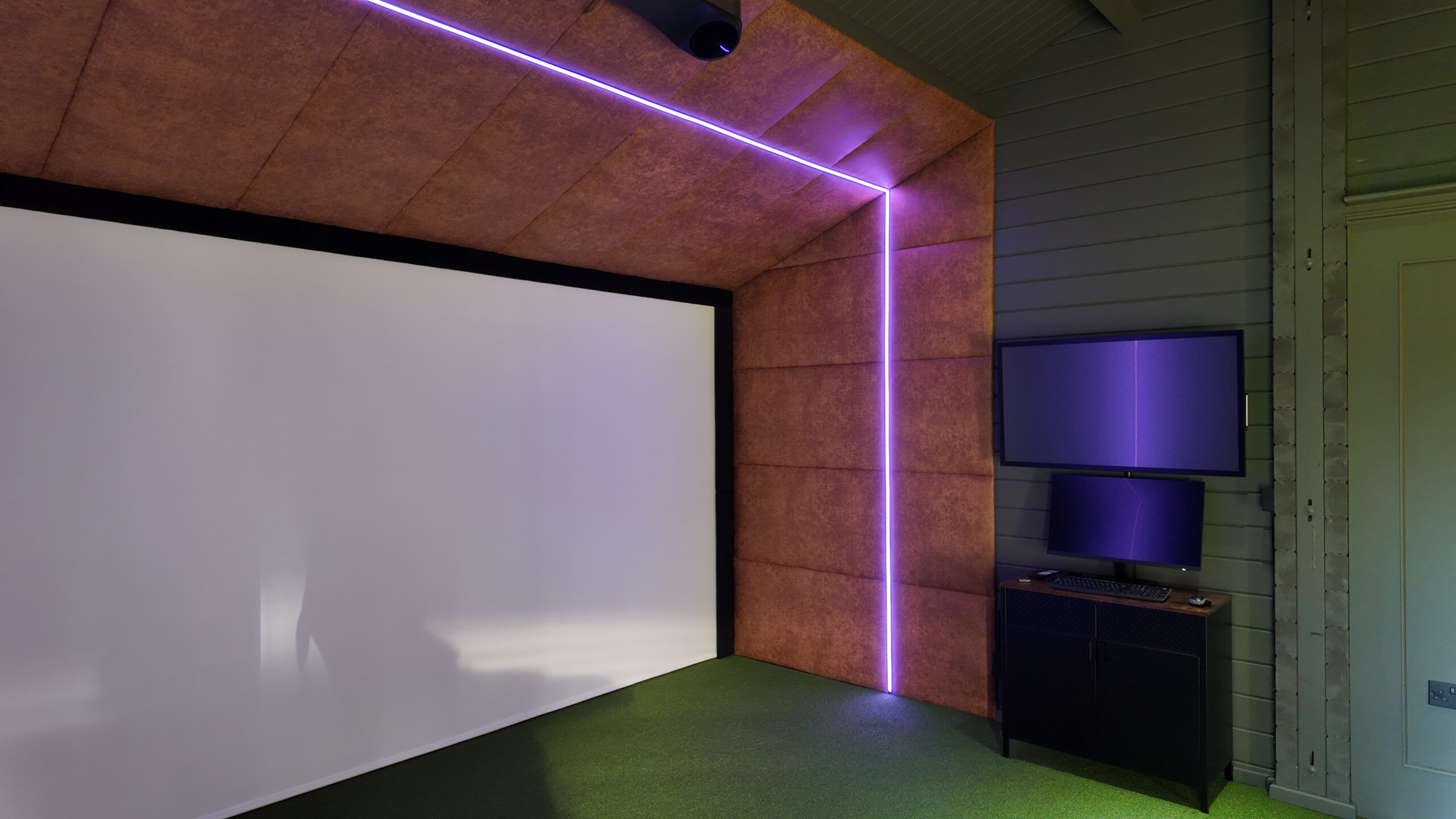 We designed and installed a purpose-built simulator cabin with an internal footprint of 6.6m x 4.5m, providing the space required for a full simulator setup and comfortable play. A custom wall and ceiling panel design was incorporated around the hitting area to create a strong visual feature and elevate the overall aesthetic of the room. Integrated LED lighting was incorporated into the cushioned wall and ceiling panel design around the simulator area, creating a striking visual feature while enhancing the atmosphere of the room.