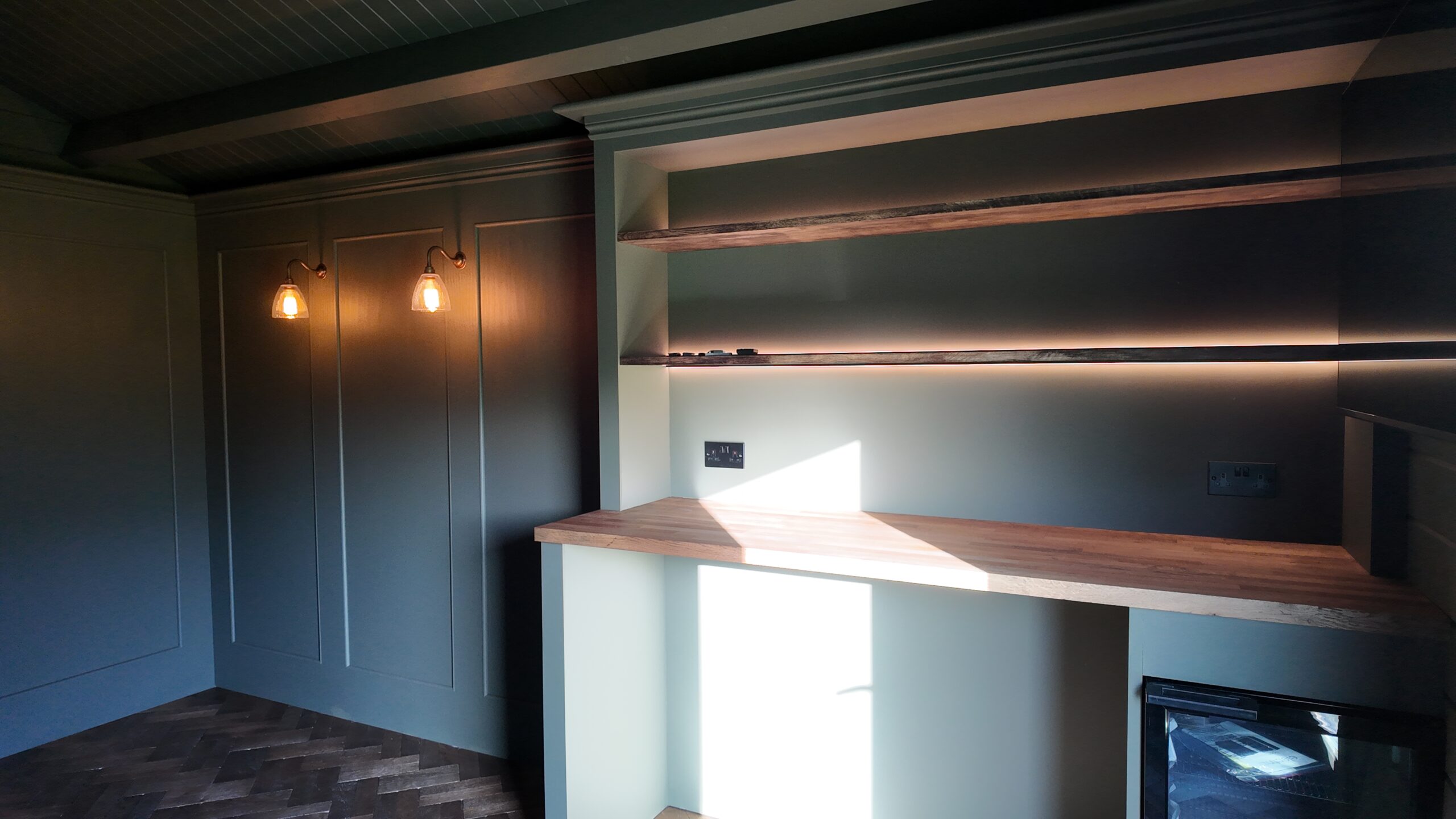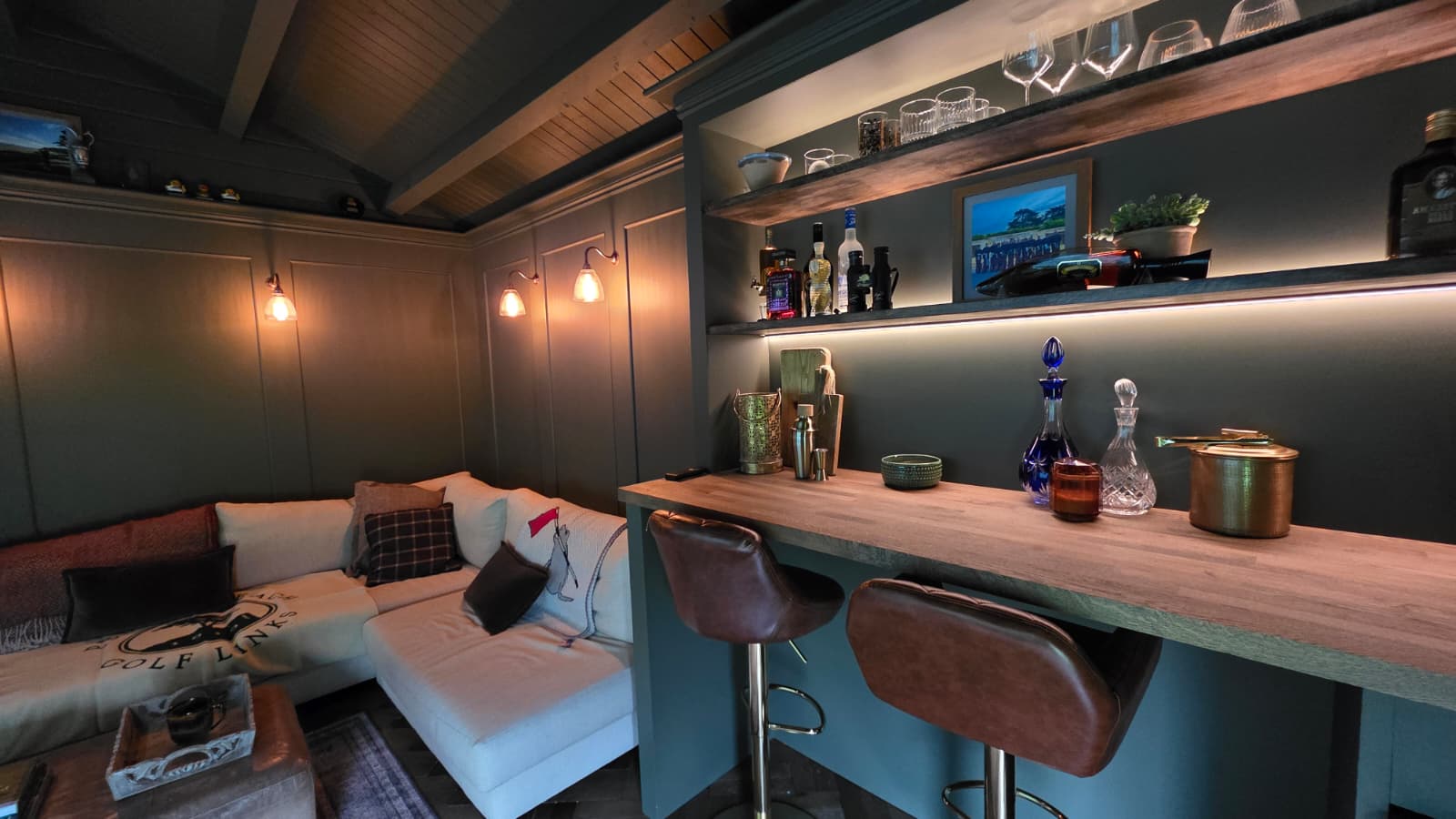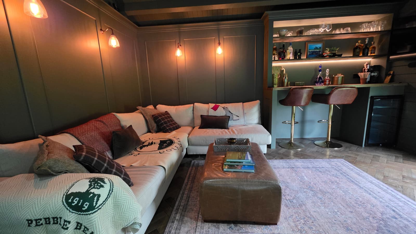 The completed simulator cabin delivers a professional indoor golf experience within a stylish and comfortable leisure space. The generous internal dimensions allow for unrestricted play, while the lighting design, feature wall panels, and bar area give the room a distinctive and premium feel. The result is a private golf retreat that can be used year-round for both practice and socialising, adding a unique and valuable leisure space to the property.
