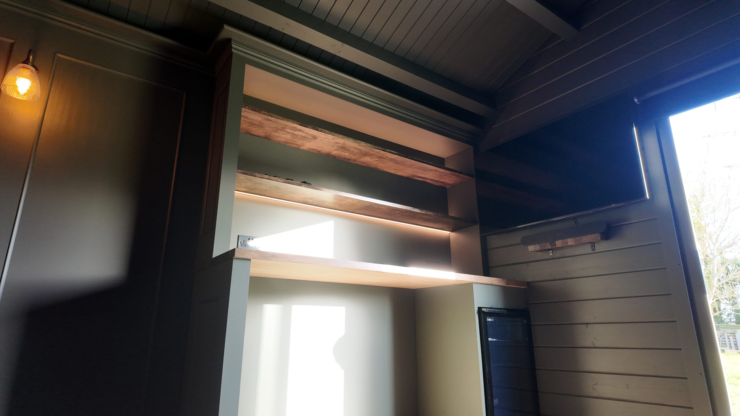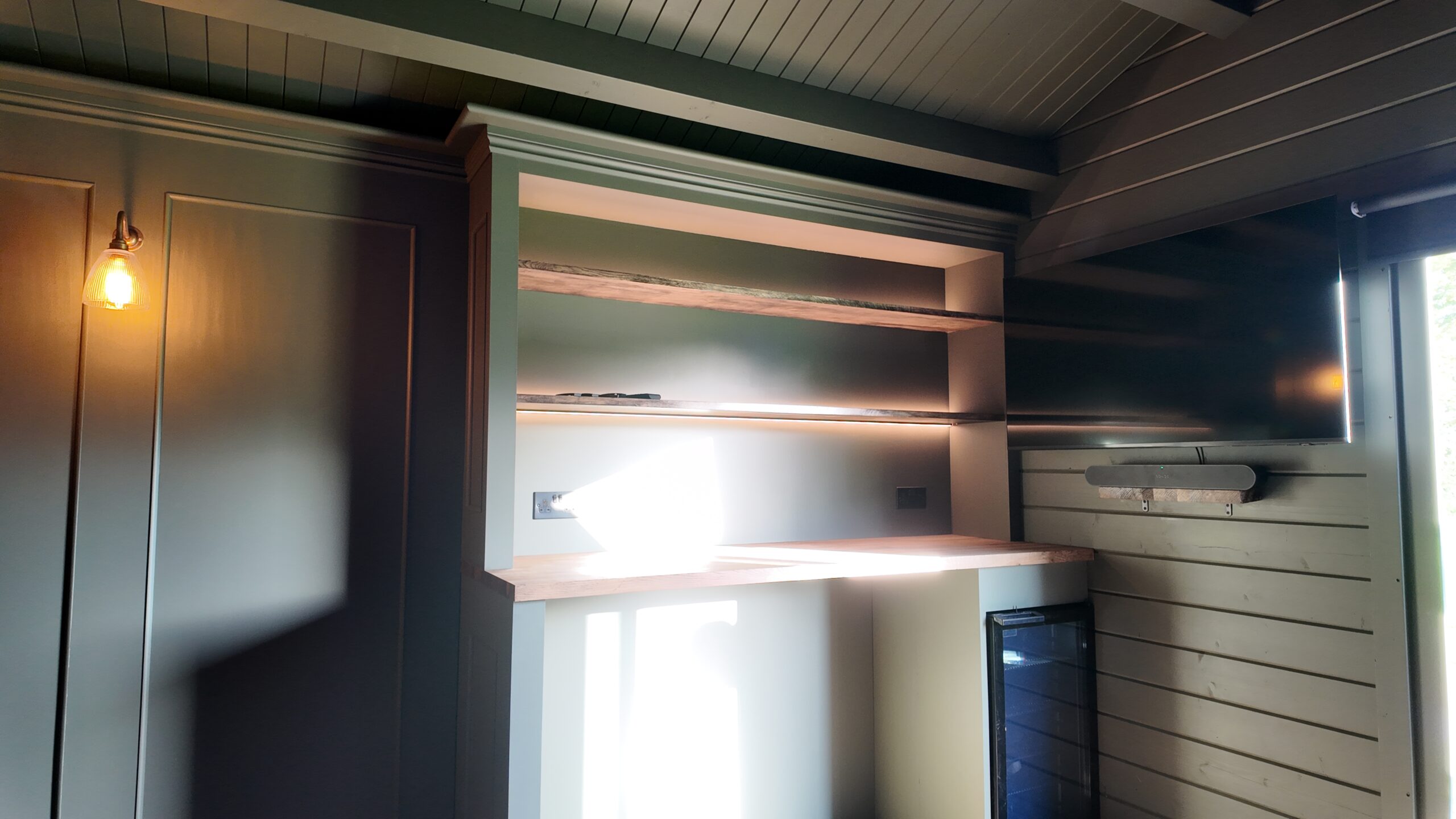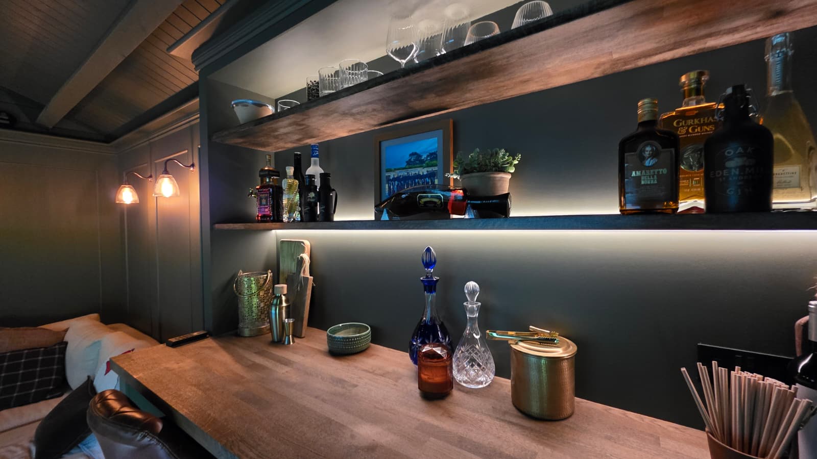 The simulator projector and tracking hardware were mounted above the hitting zone to optimise performance and maintain a clean, uncluttered layout. Along one side of the cabin, a bespoke bar and shelving unit with integrated lighting and drinks refrigeration was installed, allowing the space to double as an entertainment area. Carefully controlled lighting and darker interior finishes help maintain clear projection on the impact screen while creating a focused simulator environment.