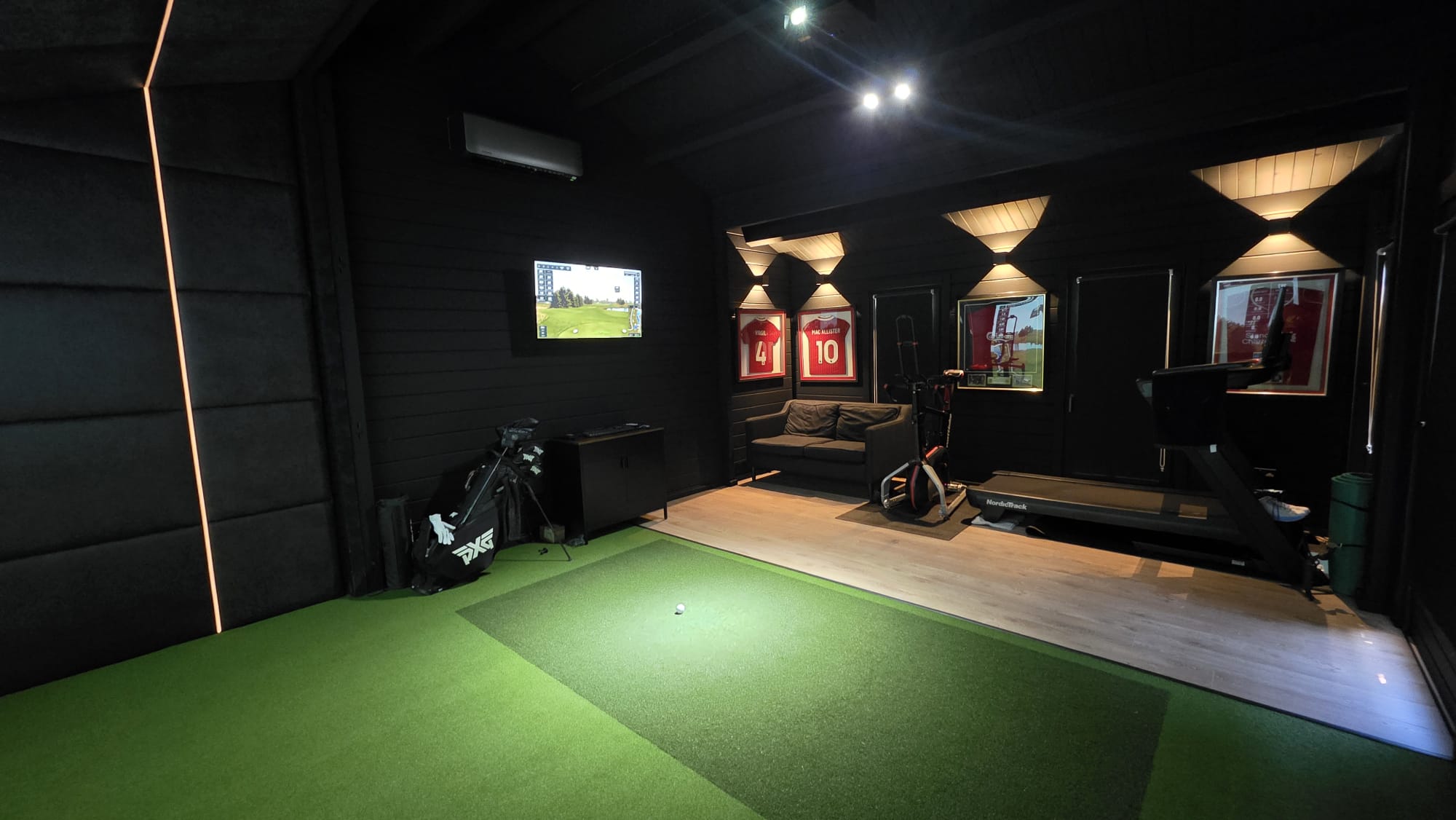 We supplied and installed a bespoke, purpose-built timber cabin designed specifically for golf simulation. The structure was finished in a dark external cladding to blend into the surrounding trees and planting, keeping the visual impact minimal. Internally, the cabin was configured to create a controlled simulator environment, with dark finishes to reduce light spill and enhance screen clarity. The layout allowed for a full simulator system, impact screen, projector, professional turf, and integrated lighting, while also accommodating seating and fitness equipment to maximise usability of the space.